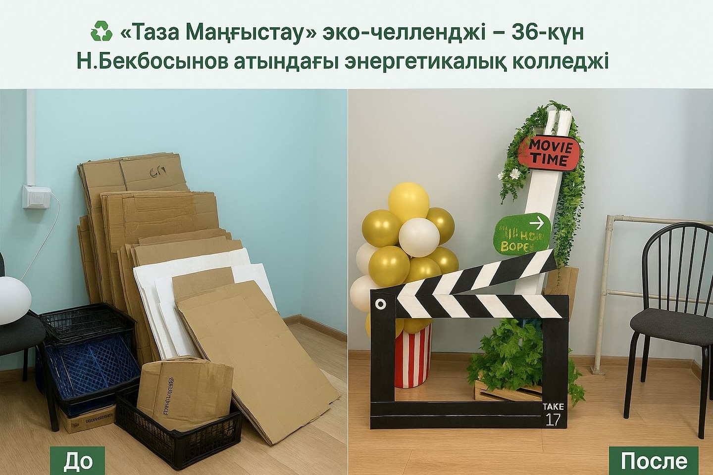 Жиналған қалдықтардың ішінен студенттер жаңа, қажетті зат жасап шықты – жылтыратып безендірілген, іс-шараға арналған кинокадр (клаппер) және декор элементтері.